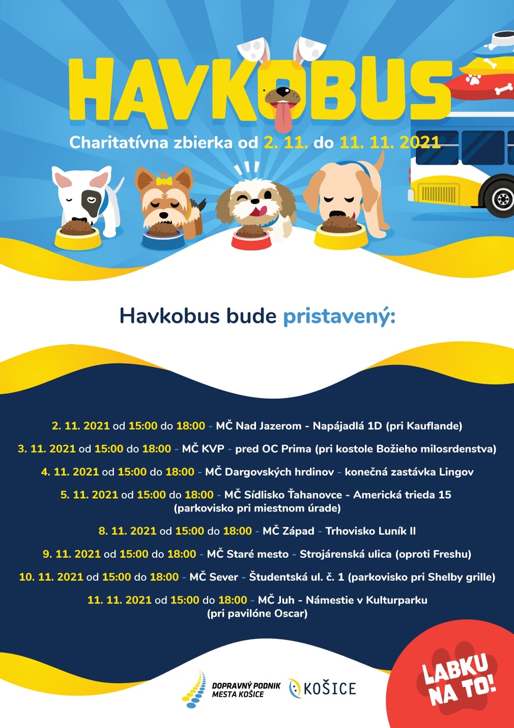 DPMK vyzýva verejnosť na zapojenie sa do zbierky pre opustené psy z útulkov. Havkobus zavíta do ôsmich mestských častí v Košiciach, vyzbiera potrebné veci a odtiaľ ich odnesie do útulkov Únia vzájomnej pomoci, Malá farma, Psy ulice a Východoslovenské labky. Záujemcovia môžu prispieť finančne aj materiálne.