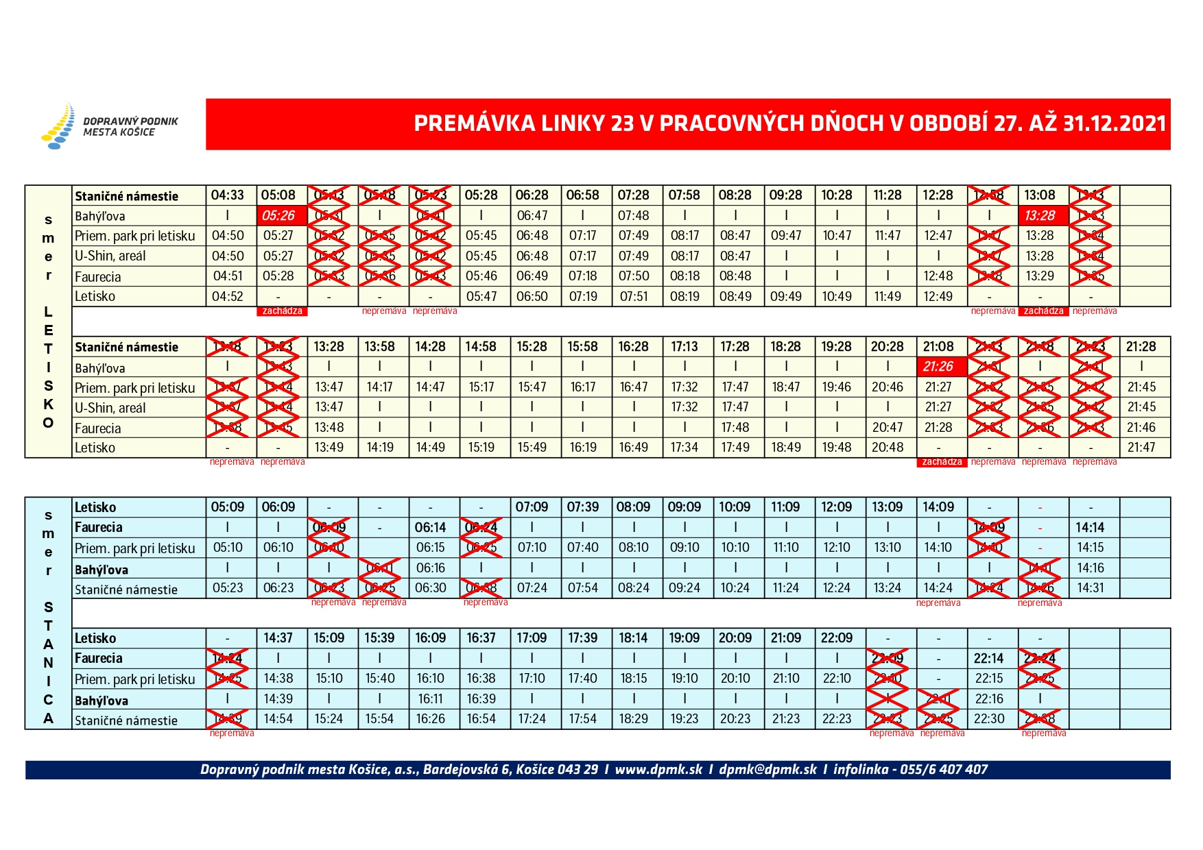 V súvislosti s úpravou pracovnej doby v priemyselnom parku pri letisku (spol. U-Shin, Faurecia, Howe, Minebea, Windsor) v pracovných dňoch 20.12. – 23.12.2021 bude premávať linka 23 v štandardnom režime. V pracovných dňoch 27.12.- 31.12.2021 bude linka premávať v obmedzenom režime. Počas dní 24., 25. a 26.12.2021 sa nebudú vykonávať ranné posilové spoje na tejto linke – ide o spoje o 05:18 hod. zo Staničného námestia a o 06.09 a 06:19 hod. z Faurecie.