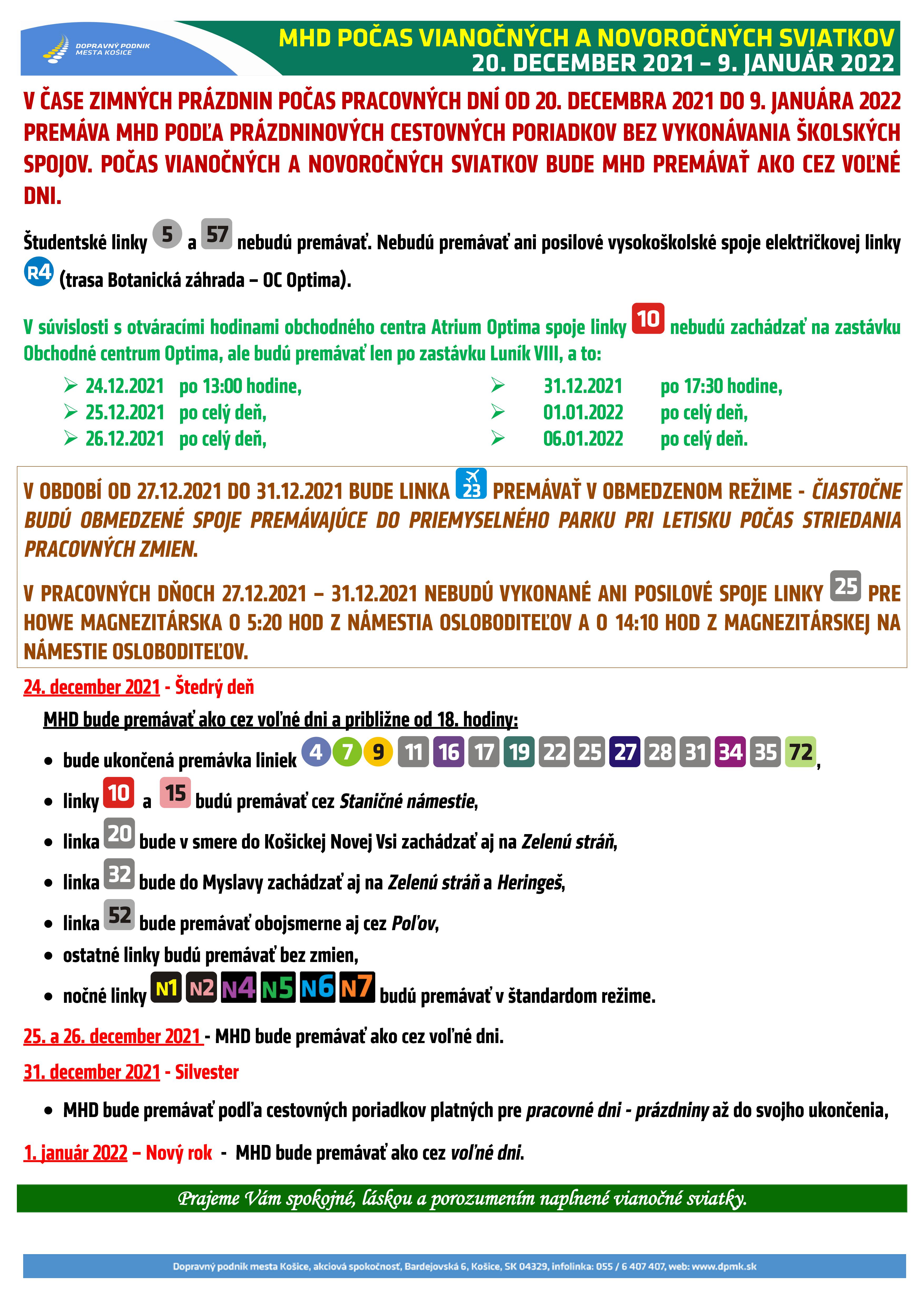 KOŠICE, 21.12.2021: DPMK avizuje režim ,,školské prázdniny“ v období 20.12.2021 - 07.01.2022, budú platiť aj osobitné obmedzenia na linkách 10 a 23. Spoje budú v dňoch 24.12., 25.12., 26.12.2021, 01.01. a 06.01.2022 premávať v režime ,,voľné dni“.