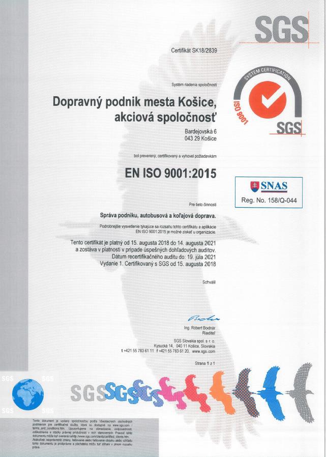 Spoločnosťou SGS Slovakia spol. s r.o. bol v mesiaci júl 2024 v Dopravnom podniku mesta Košice, a.s. vykonaný recertifikačný audit systému manažérstva kvality. Audítori posúdili existujúci manažérsky systém z hľadiska zhody s požiadavkami normy EN ISO 9001:2015 a našej spoločnosti udelili certifikát pre systém manažérstva kvality v súlade s požiadavkami EN ISO 9001:2015 pre oblasť Správa podniku, autobusová a koľajová doprava. Zhoda s požiadavkami normy STN EN ISO 9001 je každoročne posudzovaná dozorovými auditmi.